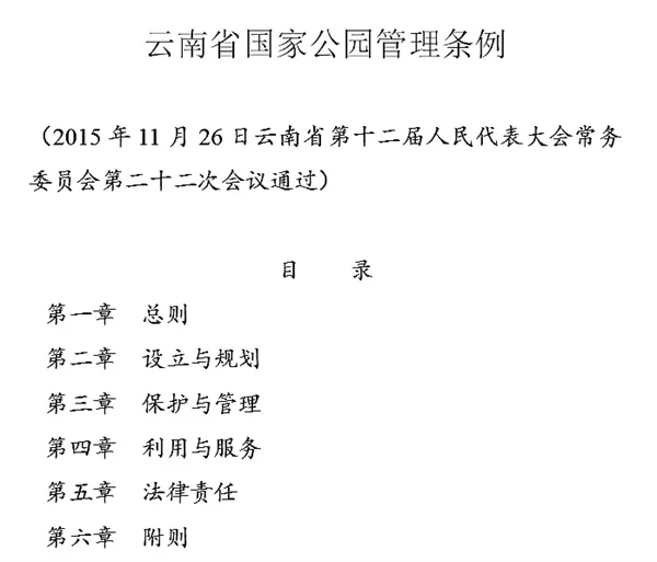 2015年11月,出臺了中國大陸首部國家公園地方性法規——《云南省國家公園管理條例》。