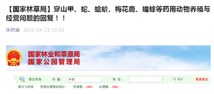 【國家林草局】穿山甲、蛇、蛤蚧、梅花鹿、蟾蜍等藥用動(dòng)物養(yǎng)殖與經(jīng)營問題的回復(fù)?。?br /> 采藥翁 2022-04-15 19:16
